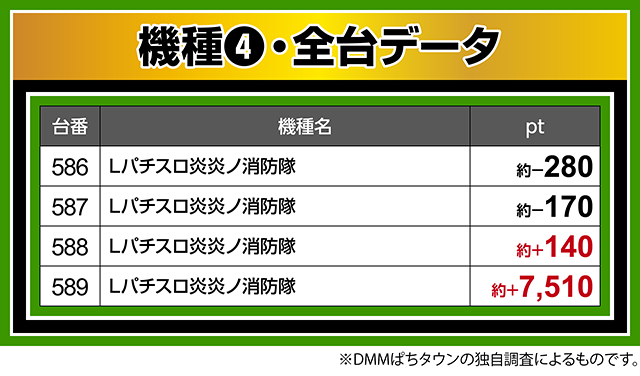 『Lパチスロ炎炎ノ消防隊』では、589番台が約+7,510ptを記録。