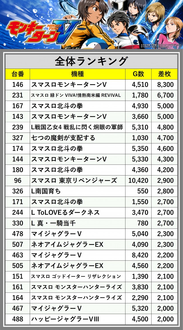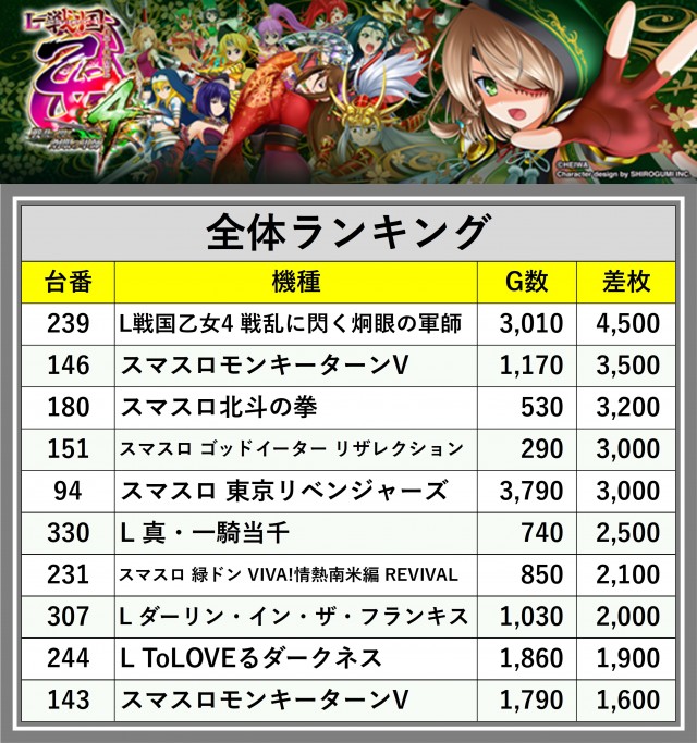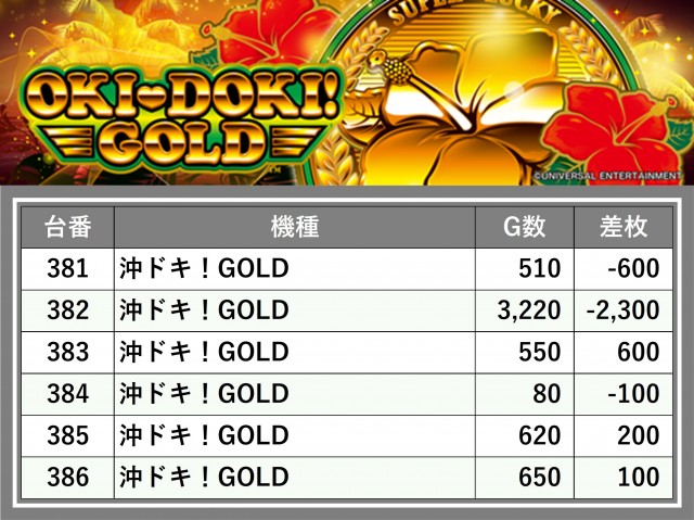 厳選された取材対象機種をはじめ、その他スロット全体から好記録が飛び出した!プレイヤーが楽しんだ1日を下記データにて振り返ってみて欲しい。