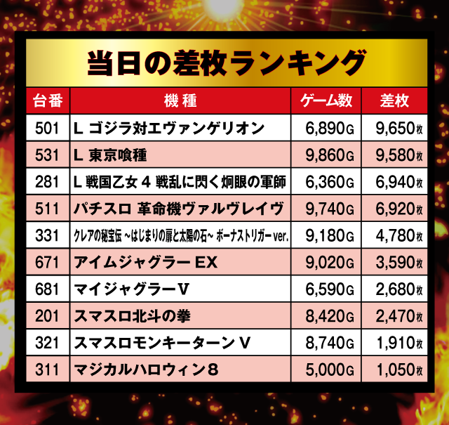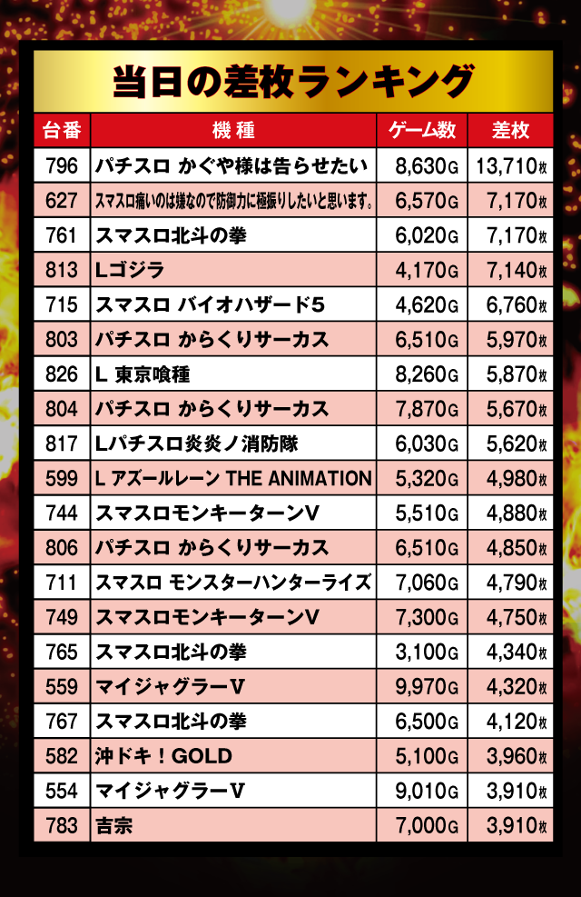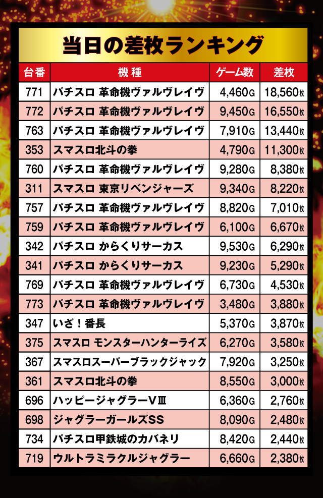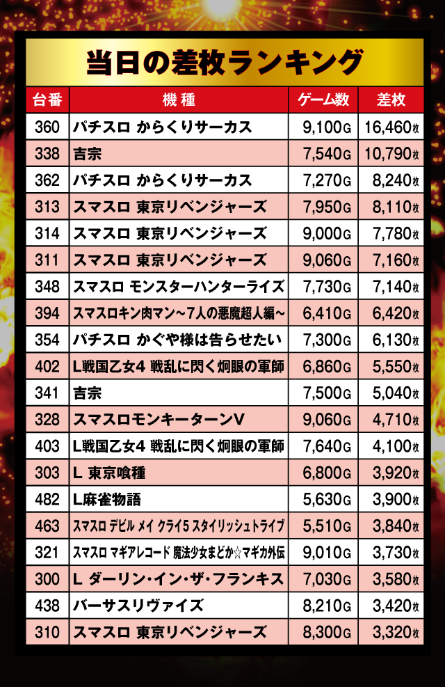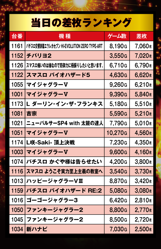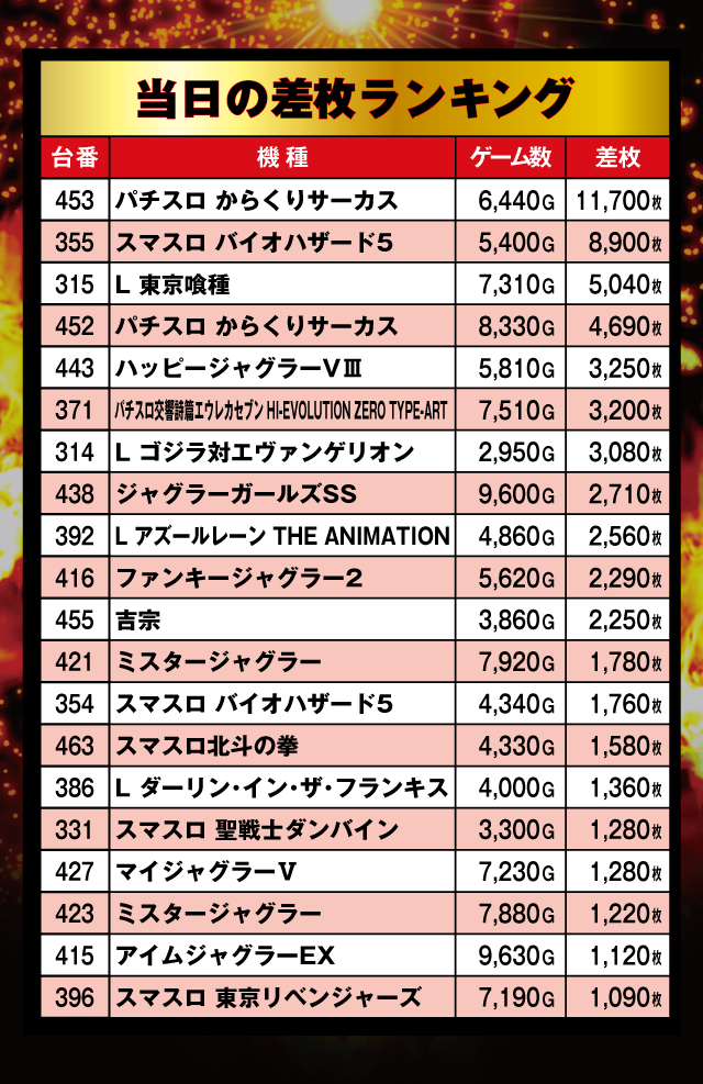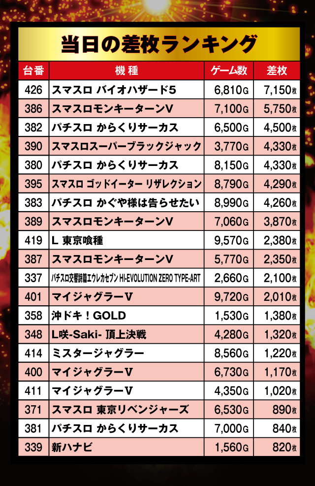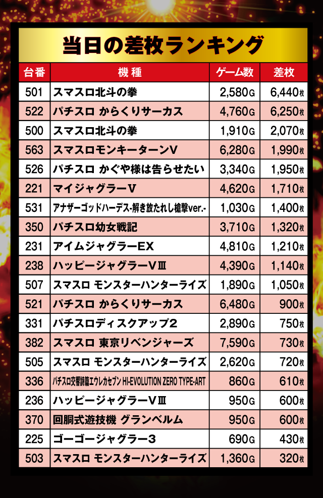 取材当日のしにせえず各店の華々しい結果の数々を、いち早く結果レポートとして公開。ぱちタウンが独自に選び抜いた機種たちと、各店の差枚ランキングに注目だ。データの詳細は以下を要チェック‼