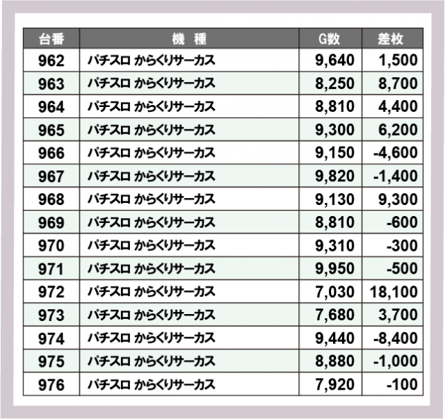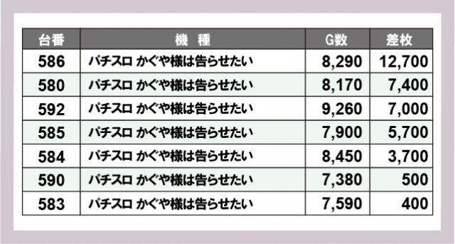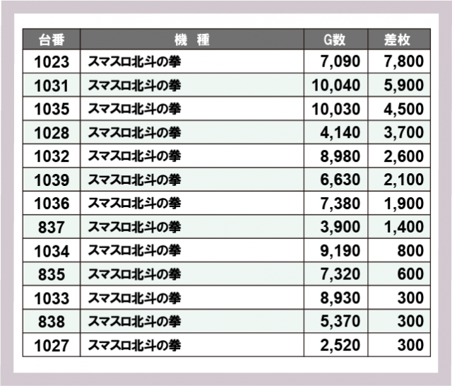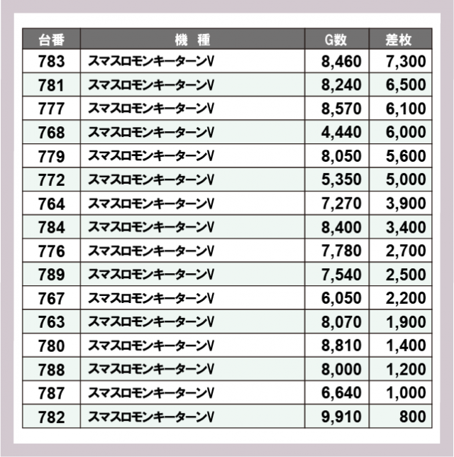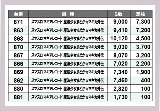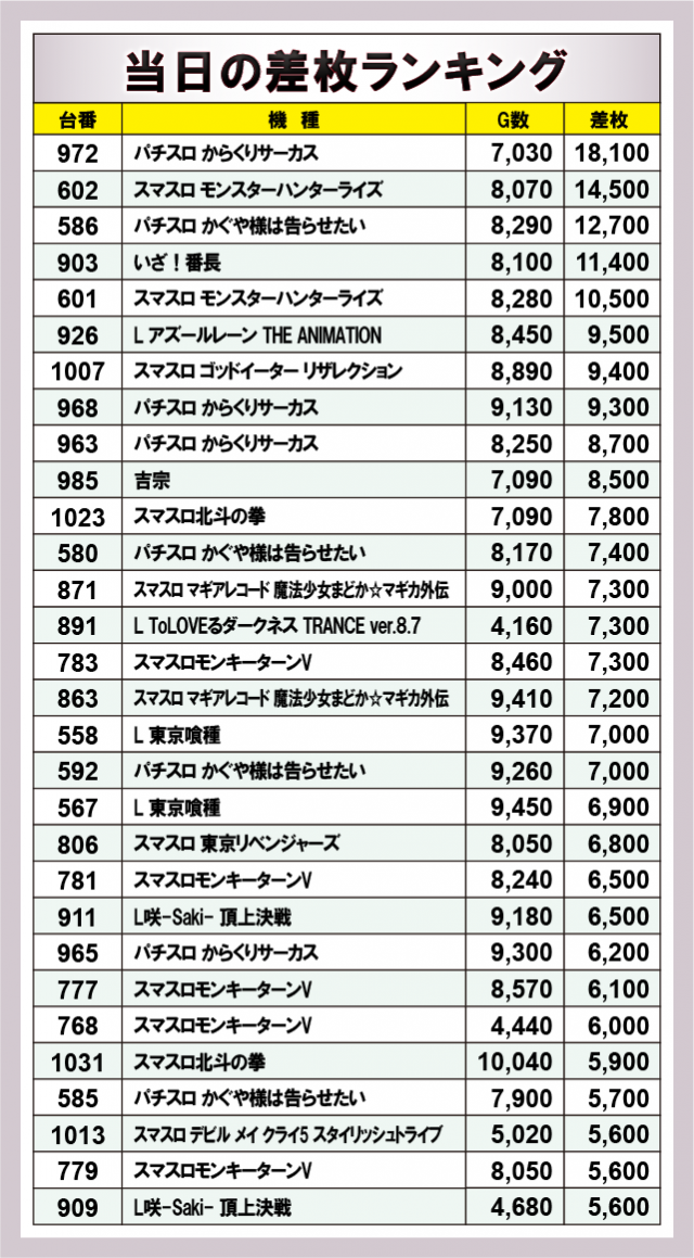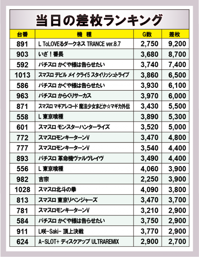 ※差枚数順に掲載しています