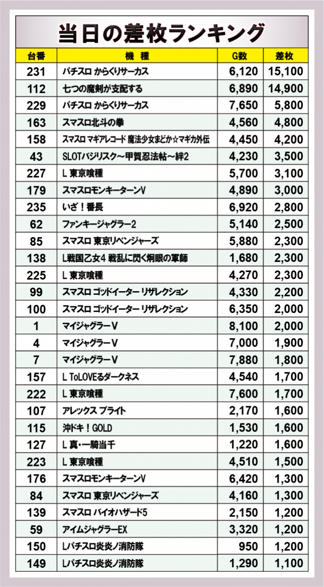 今回「ONE SPARK取材」が行われた『キコーナ市岡店』。『パチスロ からくりサーカス』が+15,100枚という記録的出玉を記録し、『七つの魔剣が支配する』も+14,900枚で応戦。他にもスマスロを中心にまとまりある差枚が続き、ジャグラーシリーズも複数台ランクイン。また、この日は関西エリア全体で『パチスロ からくりサーカス』の盛り上がりが際立っており、こうした熱気は次回も期待せずにはいられない。