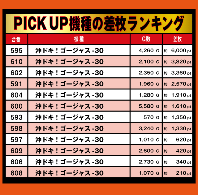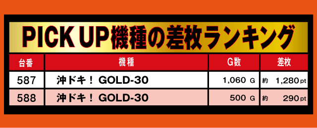 沖ドキ!シリーズからは『沖ドキ!GOLD-30』と『沖ドキ!ゴージャス-30』、『沖ドキ!BLACK』をピックアップ。『沖ドキ!ゴージャス-30』では+6,000pt、『沖ドキ!BLACK』は+4,000pt超えとポテンシャルを最大限に発揮する台が見られた。