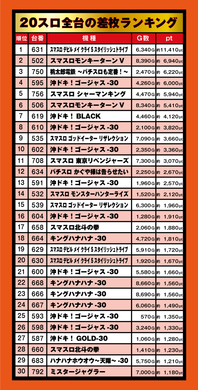 この日、最もプレイヤーの注目を集めたのが『スマスロ デビル メイ クライ5 スタイリッシュトライブ』で、631番台が+11,410ptを叩き出し堂々のランキングトップに輝いた。続く『スマスロモンキーターンV』502番台の+6,940ptを筆頭に+6,000ptオーバーが3台、+5,000ptオーバーが2台など、人気のスマスロを中心に多数の好調台が確認されている。