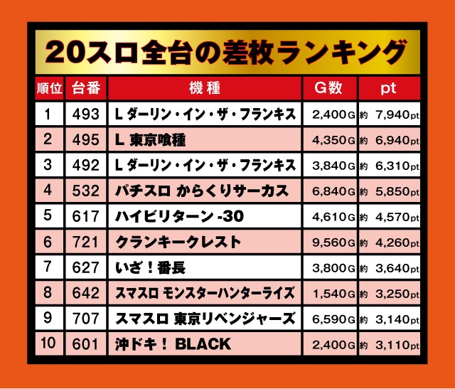 『L ダーリン・イン・ザ・フランキス』493番台が+7,940pt、492番台が+6,310ptと、ひときわ輝く成績を残した。そして『L 東京喰種』495番台が+6,940ptでつづく。他にも『パチスロ からくりサーカス』532番台の+5,850pt、『ハイビリターン-30』617番台の+4,570pt、『クランキークレスト』721番台の+4,260ptと優秀台が多数誕生した1日となった。