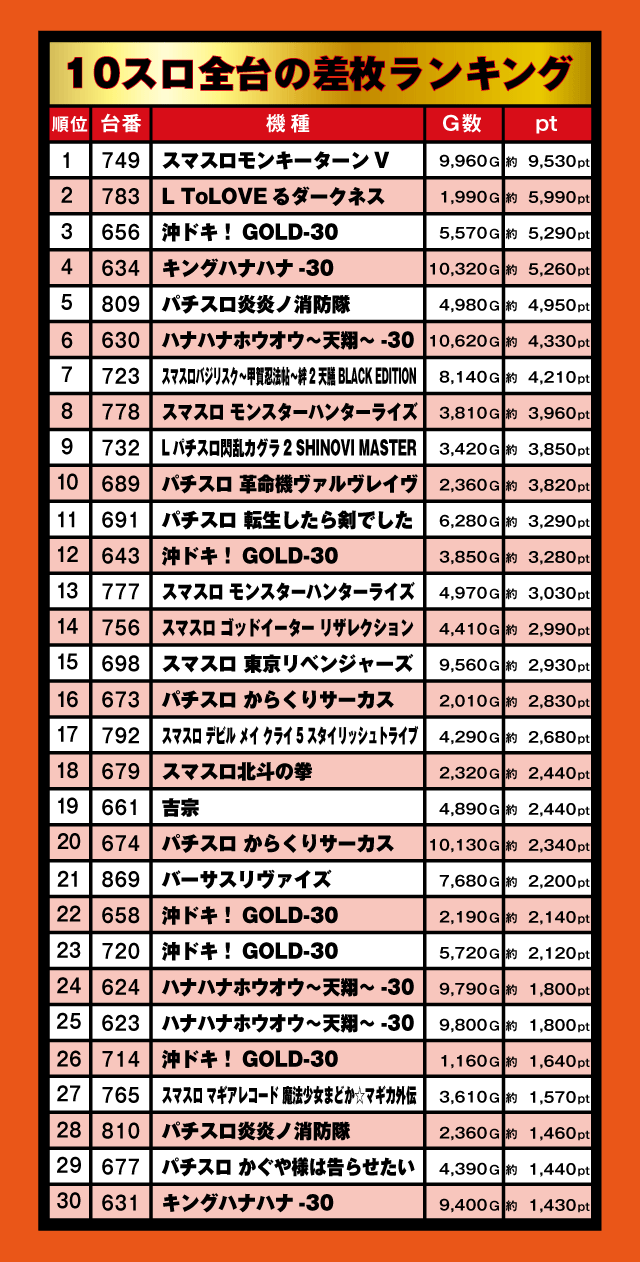 頭ひとつ飛びだしたのは『スマスロモンキーターンV』。749番台が+9,530ptと優秀な成績をのこしていた。そして『L ToLOVEるダークネス』783番台が+5,990pt、『沖ドキ!GOLD-30』656番台が+5,290ptとつづく。以下『キングハナハナ-30』634番台の+5,260pt、『パチスロ炎炎ノ消防隊』809番台の+4,950ptなどなど、大幅プラスptの台が並ぶランキングとなっていた。