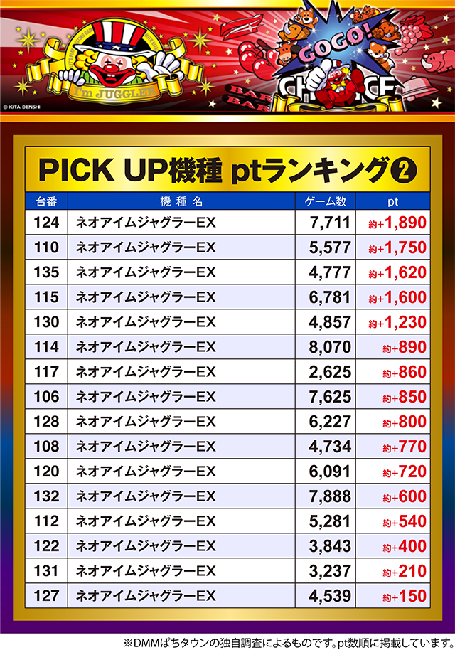 「ネオアイムジャグラーEX」では、5台が約+1,200ptオーバー。