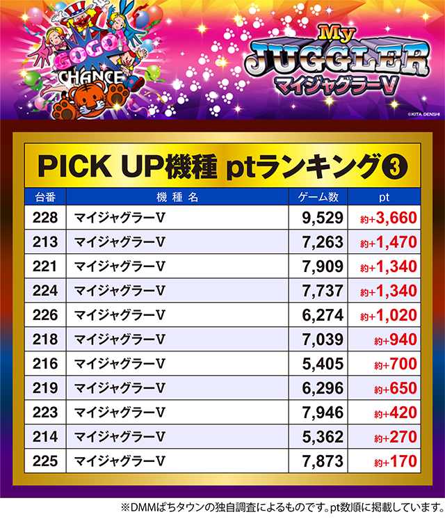「マイジャグラーⅤ」も11台がプラスとなり、5台が約+1,000pt以上。