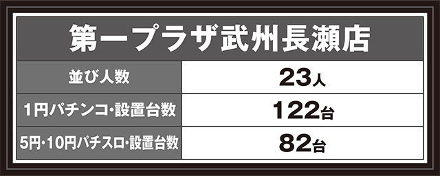 9月27日、埼玉県入間郡毛呂山町にある「第一プラザ武州長瀬店」へと向かった。今回の取材は、「低王RESEARCH」だ。お気に入りの機種でじっくりと遊技を楽しんでいるといった姿が多く、店内は明るい雰囲気となっていた。