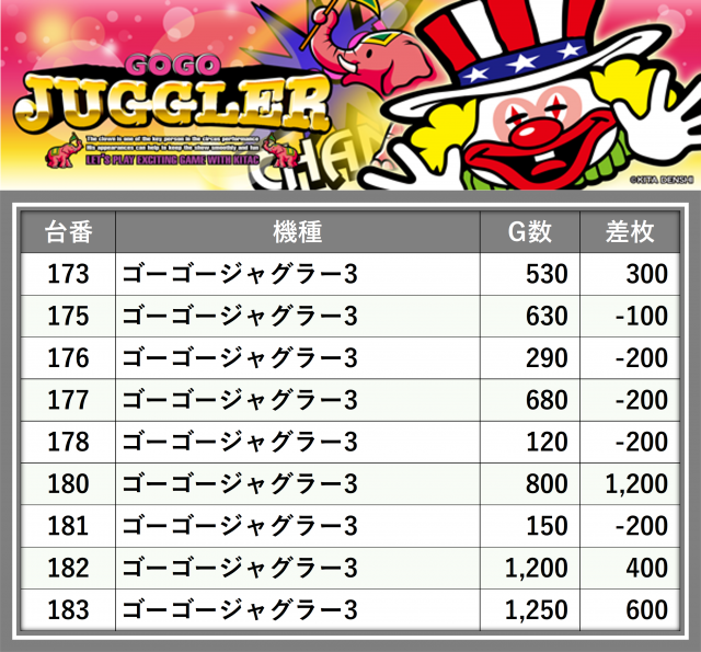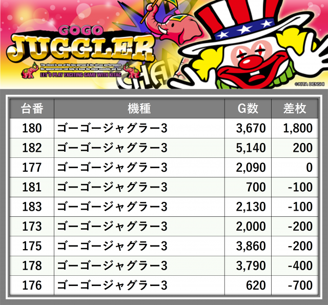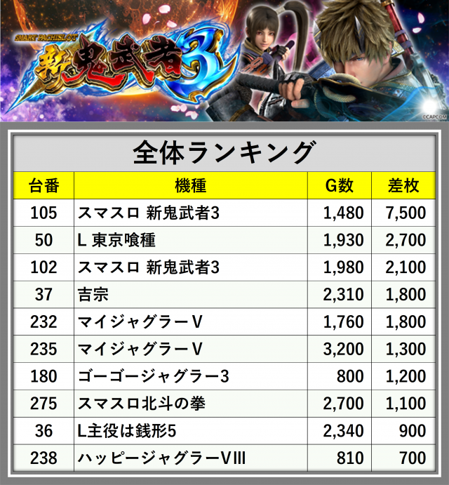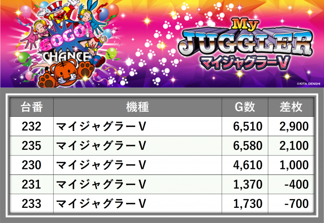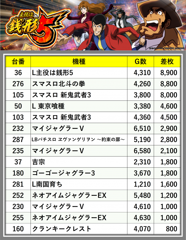 厳選された取材対象機種をはじめ、その他スロット全体から好記録が飛び出した!プレイヤーが楽しんだ1日を下記データにて振り返ってみて欲しい。