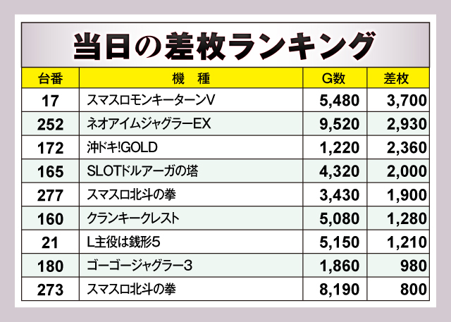 ※差枚数順に掲載しています。