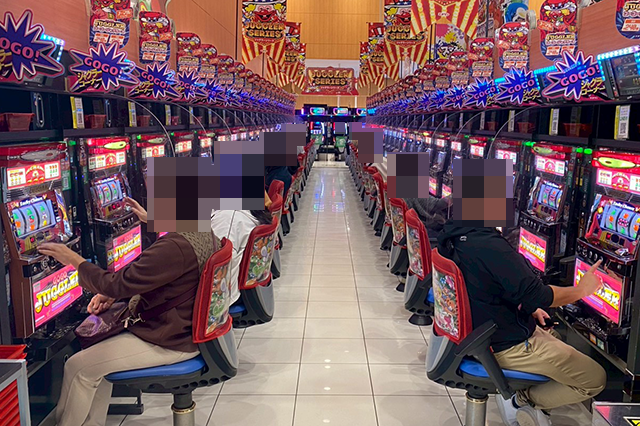 ジャグラーシリーズも人気があり、たくさんのプレイヤーが持ち玉で遊技をおこなっていた。