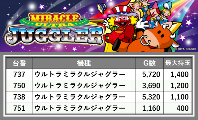 厳選された取材対象機種をはじめ、その他スロット全体から好記録が飛び出した!プレイヤーが楽しんだ1日を下記データにて振り返ってみて欲しい。