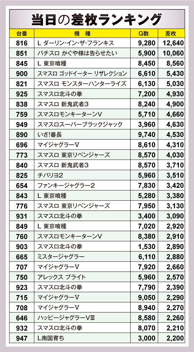この日、最もプレイヤーの注目を集めたのが『L ダーリン・イン・ザ・フランキス』で、816番台が+12,640枚を叩き出し堂々のランキングトップに輝いた。続く『パチスロ かぐや様は告らせたい』も万枚超を達成。さらに、『L 東京喰種』から+8,560枚が飛び出すなど、差枚上位が実にハイレベルな結果を残している。