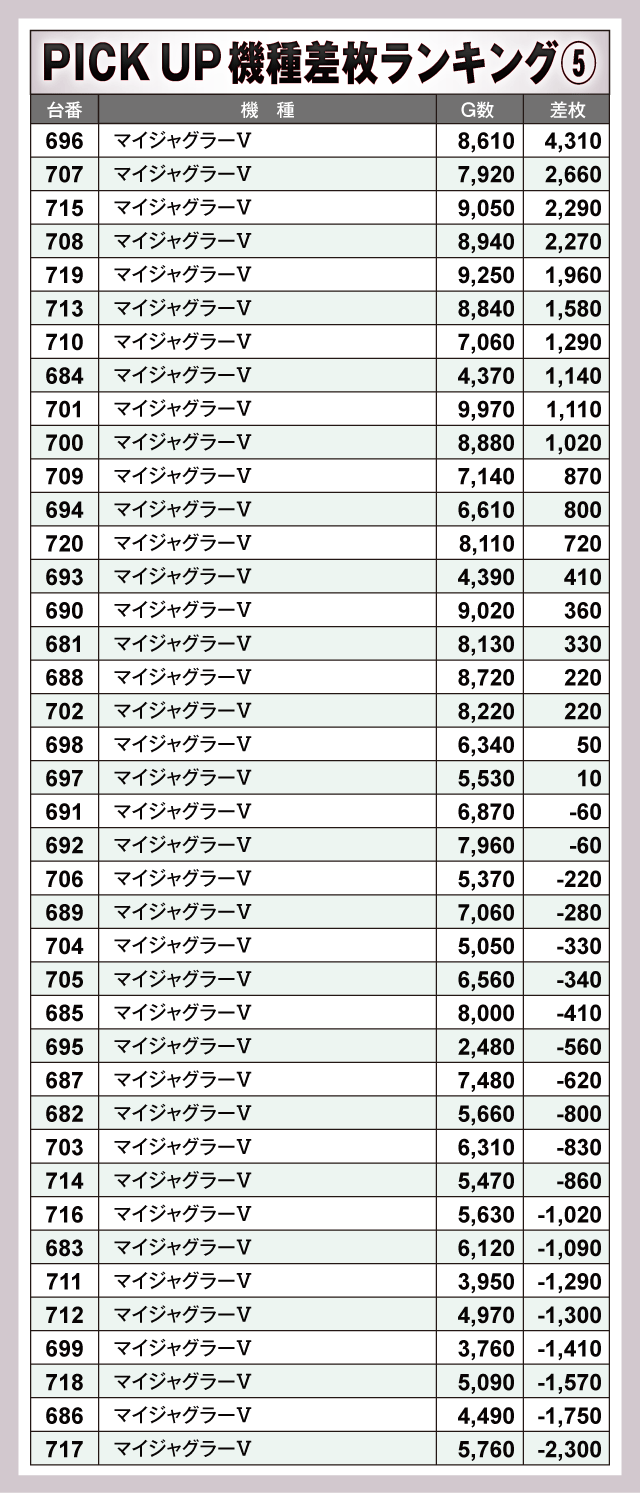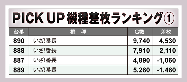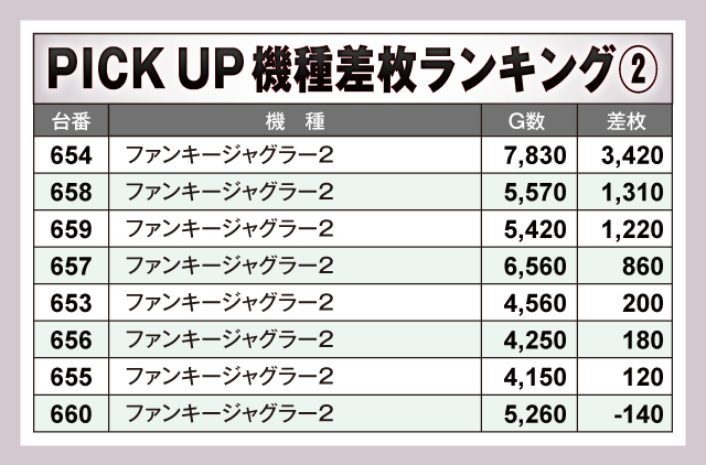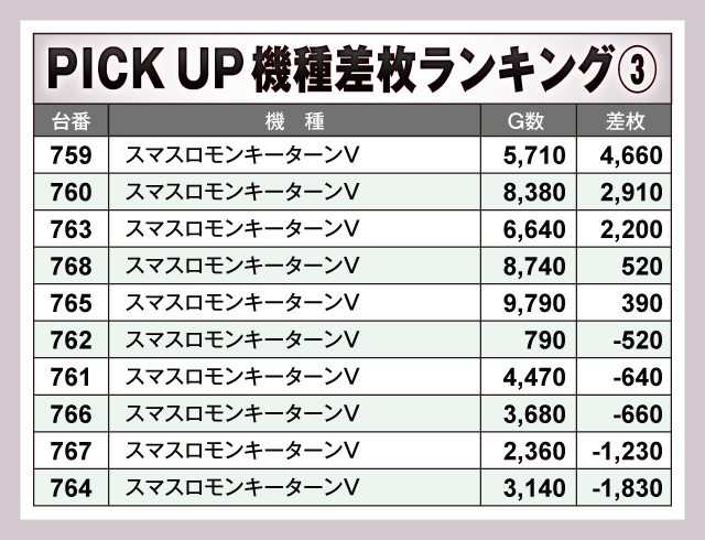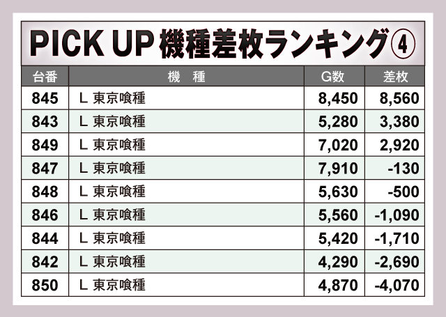 次にPICK UP機種の状況を見ていこう。ハイスコアを記録した『L 東京喰種』以外にも多数の好調台が確認されており、『いざ!番長』と『スマスロモンキーターンV』からは+4,000枚超が発生。また、ジャグラーシリーズも大奮闘しており、『ファンキージャグラー2』は+3,420枚、『マイジャグラーⅤ』は+4,310枚を筆頭にプラス差枚台が続出しファンを喜ばせていた。