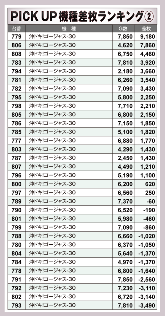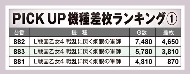次にPICK UP機種の状況を見ていこう。ランキングを制した『パチスロ かぐや様は告らせたい』以外にも多数の好調台が確認されており、『スマスロモンキーターンV』からは+8,880枚、『L戦国乙女4 戦乱に閃く炯眼の軍師』からは+4,650枚が発生。また、同店の主力機種である『沖ドキ!ゴージャス-30』と『マイジャグラーⅤ』は、どちらも半数以上の台がプラス差枚となる見事な結果を残している。
