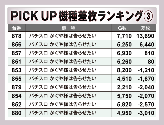 この日、最もプレイヤーの注目を集めたのが『パチスロ かぐや様は告らせたい』で、878番台が+13,690枚を叩き出し堂々のランキングトップに輝いている。さらに、『Lパチスロ炎炎ノ消防隊』と『スマスロ 新鬼武者3』も万枚超を達成。差枚ベスト3が全て大台超えとなる盛況ぶりを披露しファンを喜ばせていた。