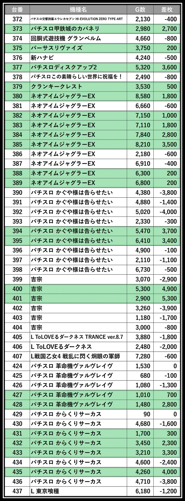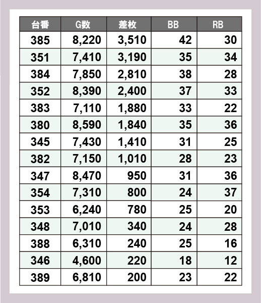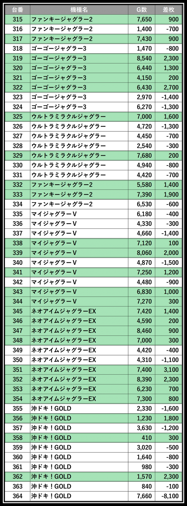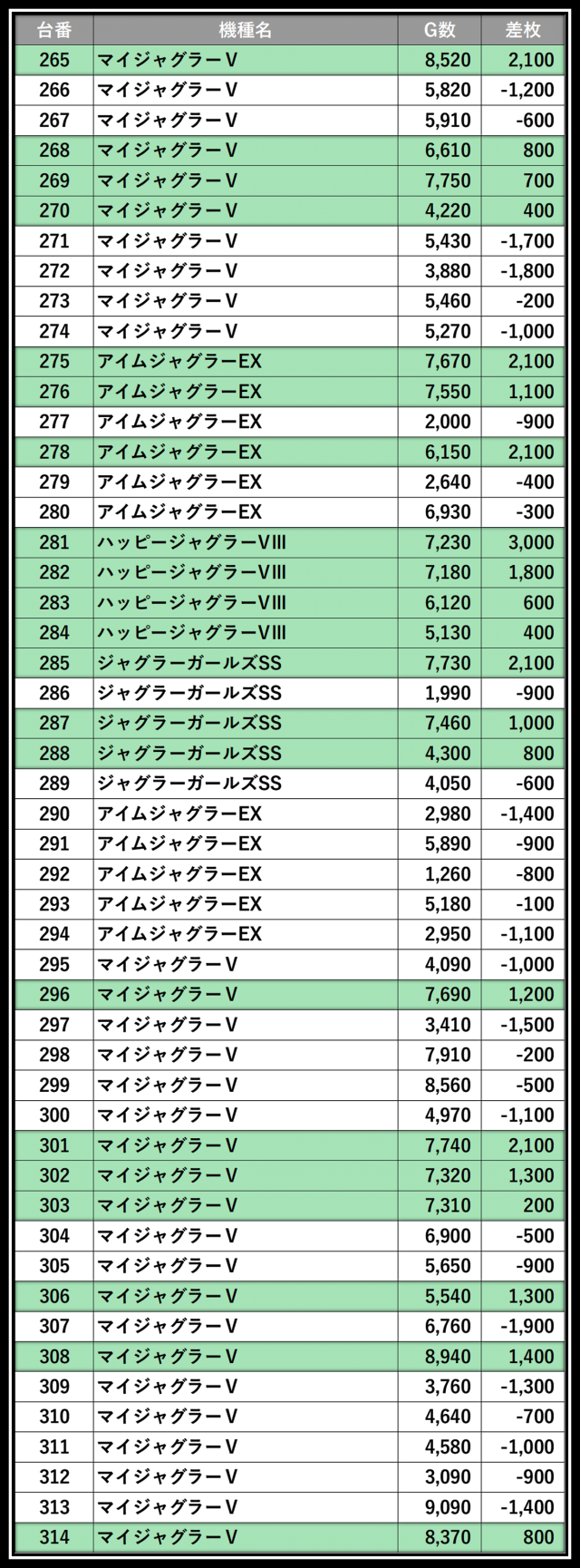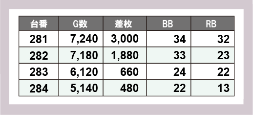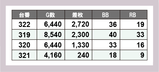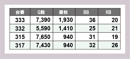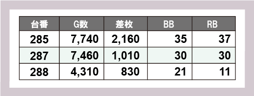 『ネオアイムジャグラーEX』を筆頭に、『ハッピージャグラーVⅢ』『ファンキージャグラー2』『ゴーゴージャグラー3』『ジャグラーガールズSS』から複数の優秀台が出現!なかでも『ネオアイムジャグラーEX』は3,000枚OVER×2台、2,000枚OVER×2台と存在感抜群。さらに各機種で6〜8,000Gに迫る高稼働を記録し、ジャグラーシリーズ全体が一日を通して大きな盛り上がりを見せた。