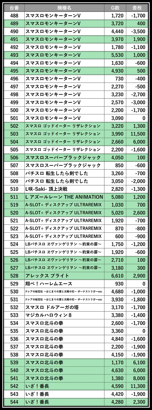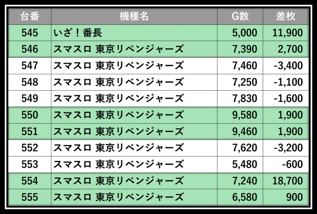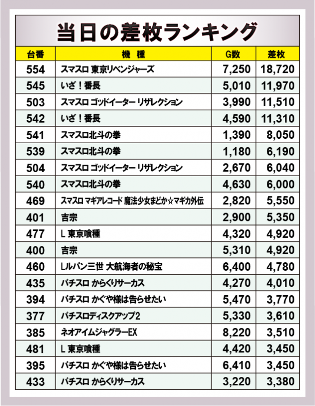 『スマスロ 東京リベンジャーズ』では+18,720枚という圧巻の記録が飛び出し、コンプリート目前の勢いを披露。万枚台が計4台も誕生し、スマスロ勢がランキングを独占するかに見えたが、『パチスロディスクアップ2』や『ネオアイムジャグラーEX』が3,500枚OVERでランクインしており、メダル機からも確かな盛り上がりが感じられた。