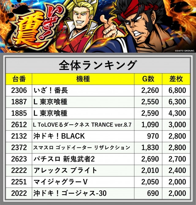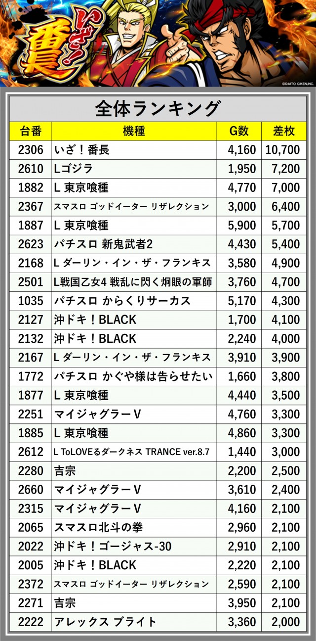 厳選された取材対象機種をはじめ、その他スロット全体から好記録が飛び出した!プレイヤーが楽しんだ1日を下記データにて振り返ってみて欲しい。