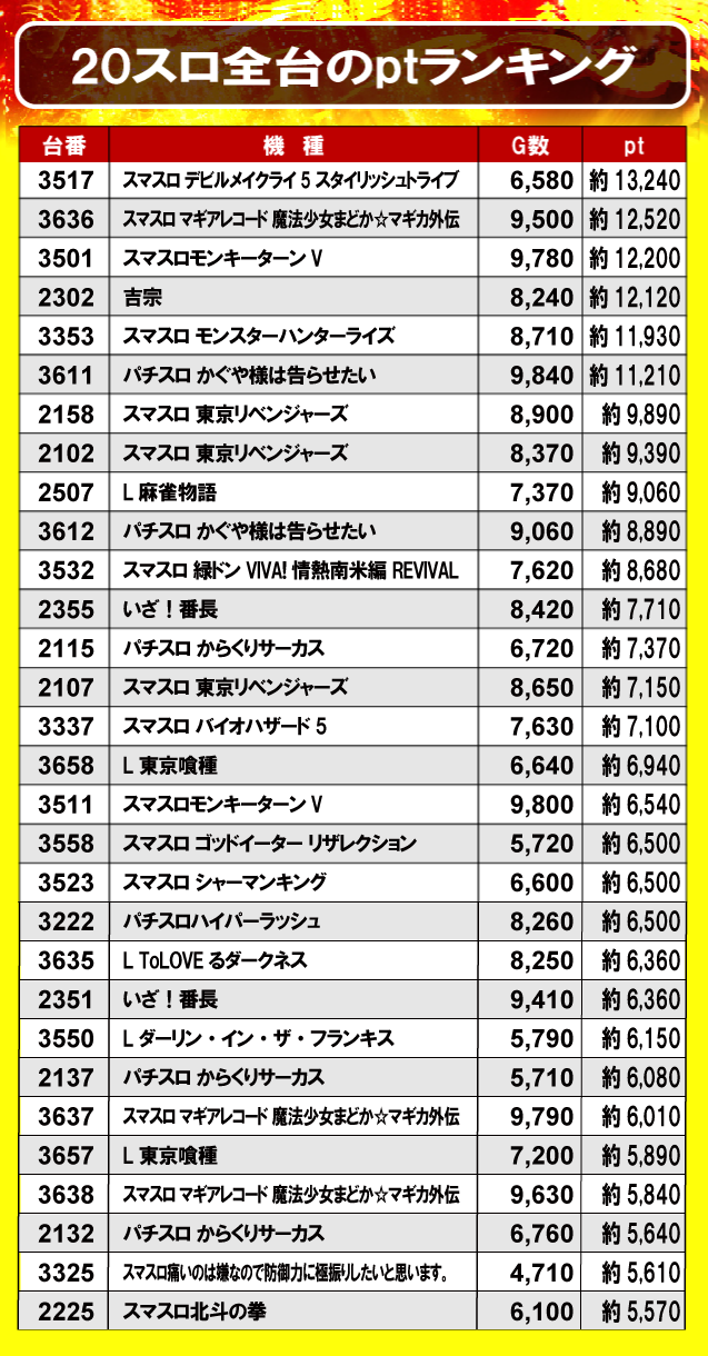 『スマスロ デビルメイクライ5 スタイリッシュトライブ』『スマスロ マギアレコード 魔法少女まどか☆マギカ外伝』『スマスロモンキーターンV』『吉宗』『スマスロ モンスターハンターライズ』『パチスロ かぐや様は告らせたい』から万ptOVERが生まれ、まさにハイレベルな盛り上がりを見せたこの日。続く2158番台の『スマスロ 東京リベンジャーズ』は約9,890ptを記録し、惜しくも万ptには届かなかったが、そのパフォーマンスは圧巻だった!他にも優秀台がずらりと並び、次回の展開にも大いに期待が寄せられるだろう。