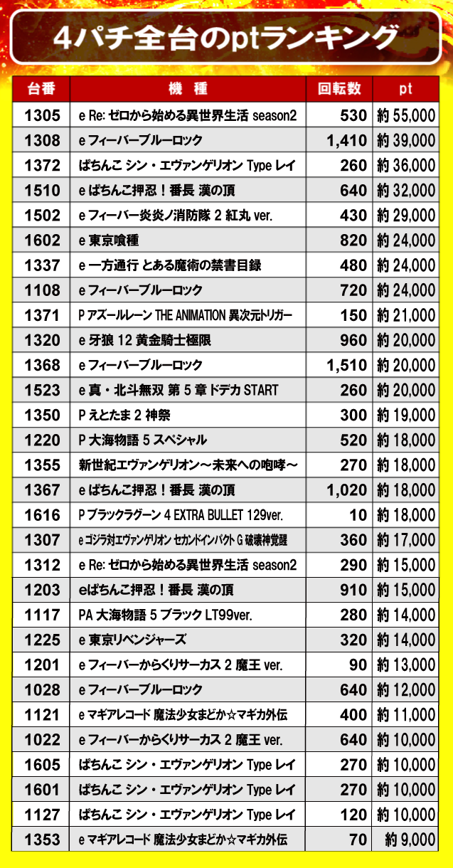 『e Re:ゼロから始める異世界生活 season2』が約55,000ptをマークし、大きな熱気を生み出していた。ランキングを見渡すと、まとまったptを獲得している台が多数存在しており、その中にはまだ眠るポテンシャルを秘めた台もありそうだ。