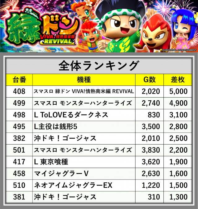 厳選された取材対象機種をはじめ、その他スロット全体から好記録が飛び出した!プレイヤーが楽しんだ1日を下記データにて振り返ってみて欲しい。