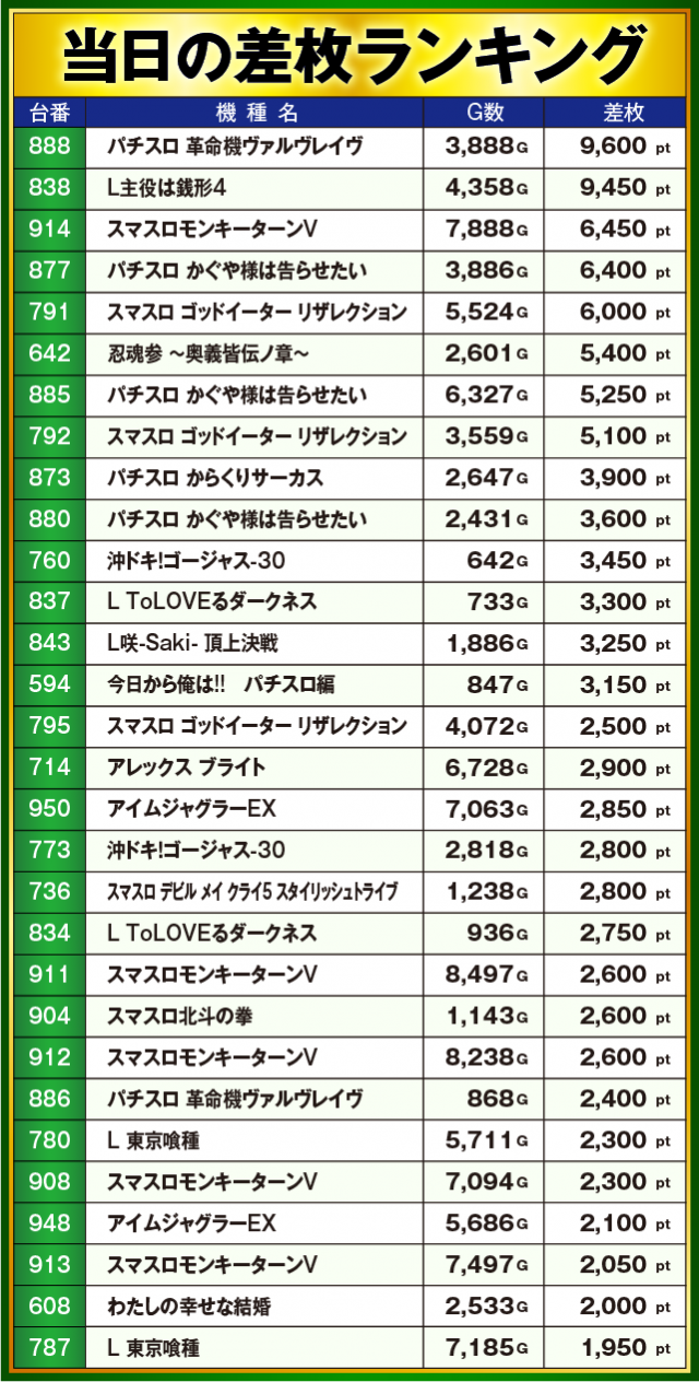 レポートの最後に「Super D’STATION金古店」の差枚ランキングも掲載!
