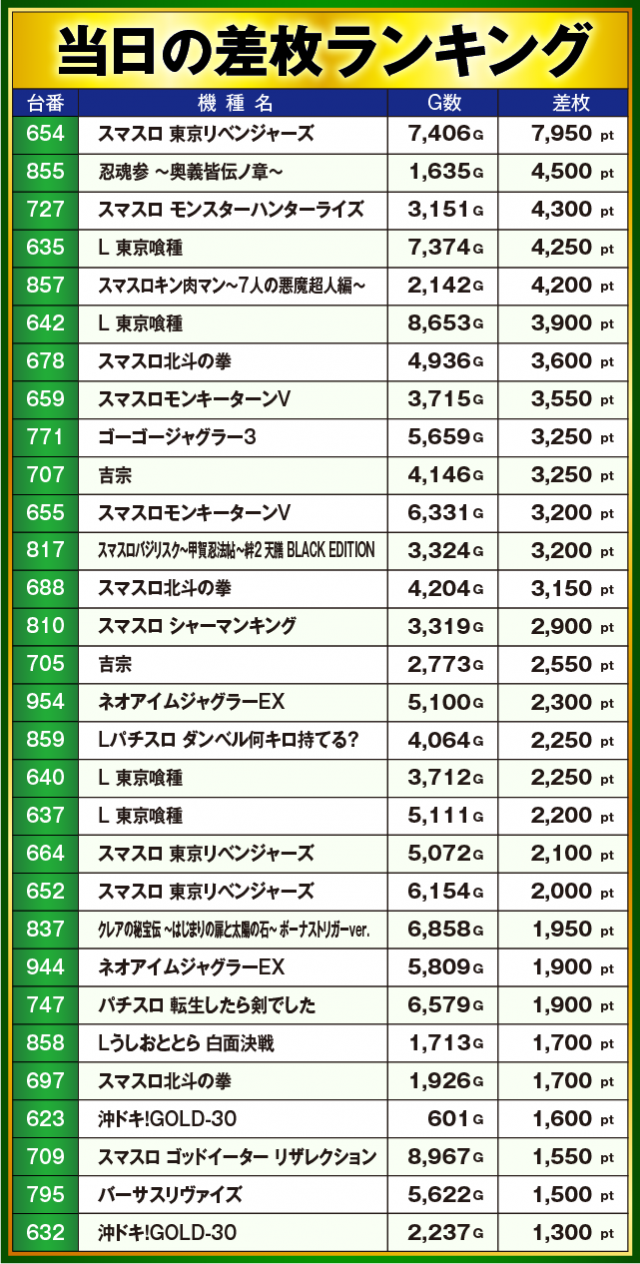 ※差枚数順に掲載しています
