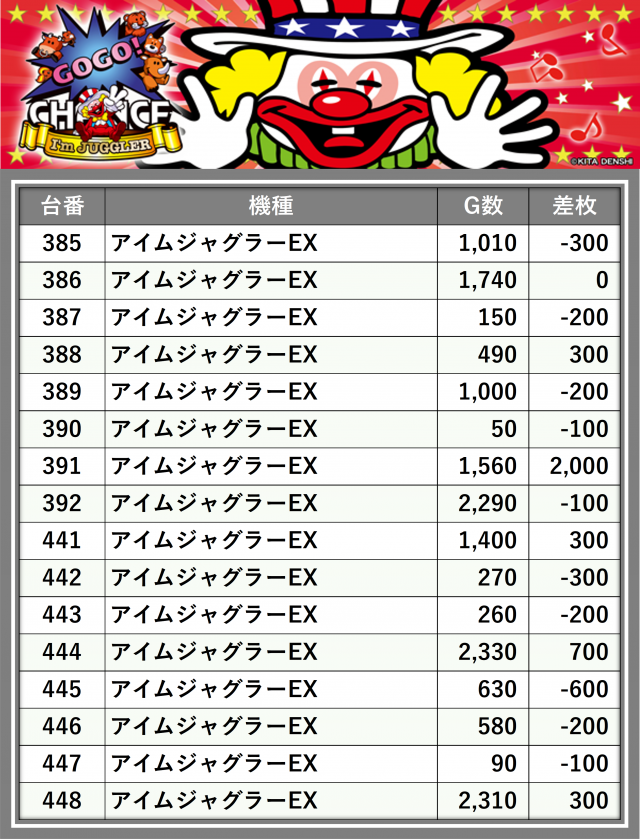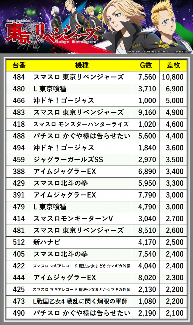 厳選された取材対象機種をはじめ、その他スロット全体から好記録が飛び出した!プレイヤーが楽しんだ1日を下記データにて振り返ってみて欲しい。
