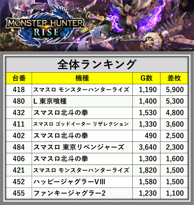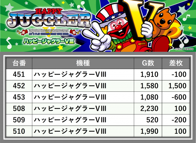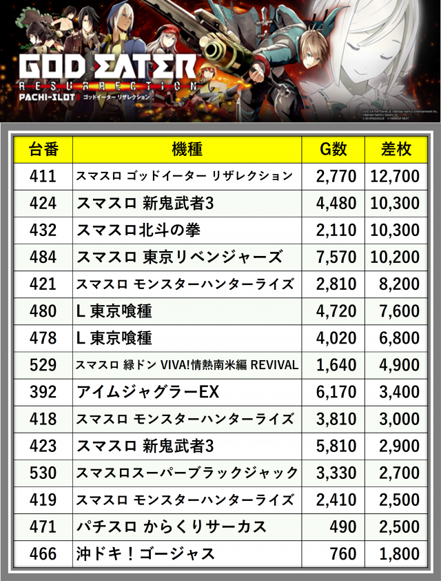 厳選された取材対象機種をはじめ、その他スロット全体から好記録が飛び出した!プレイヤーが楽しんだ1日を下記データにて振り返ってみて欲しい。
