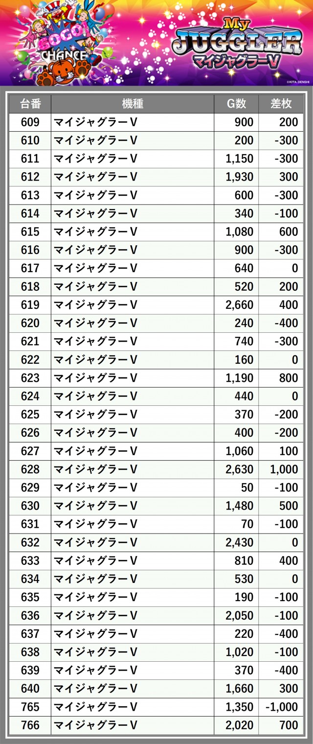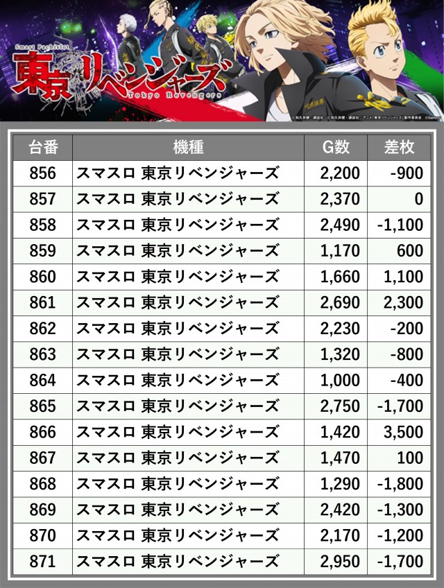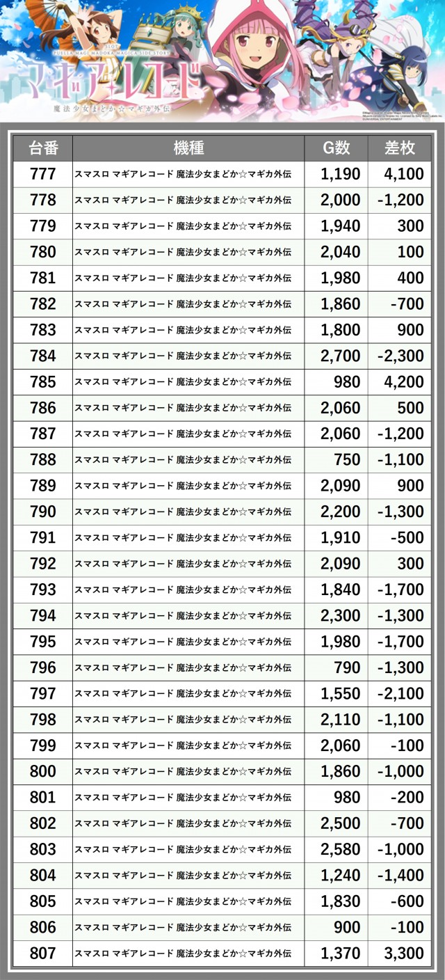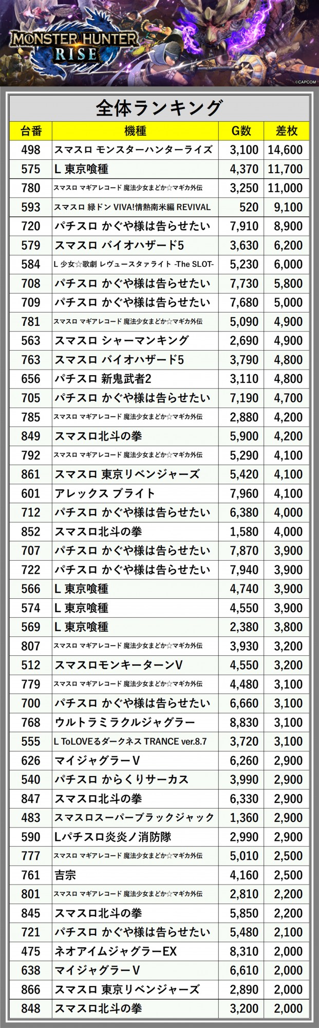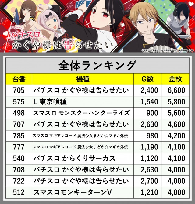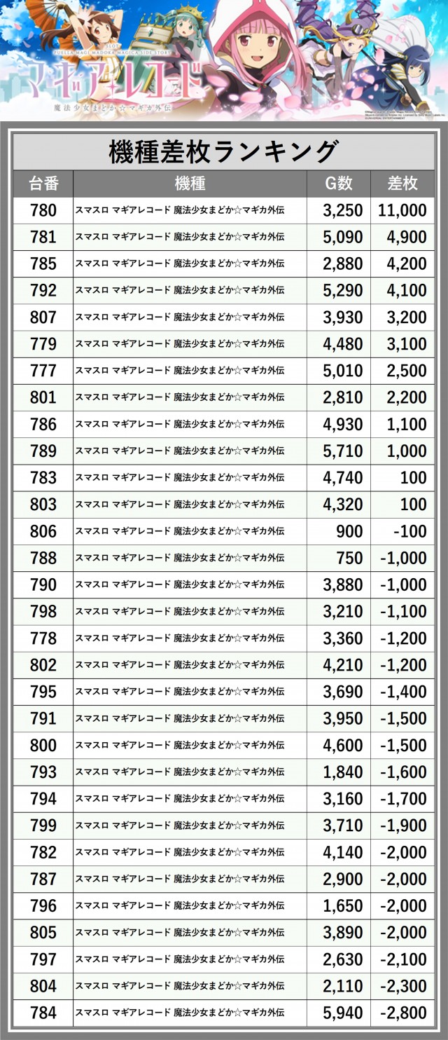 ※差枚数順に掲載しています