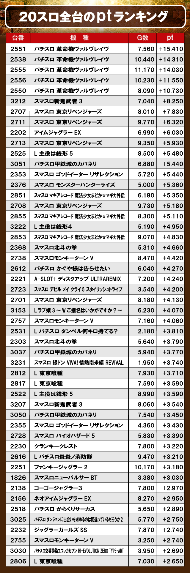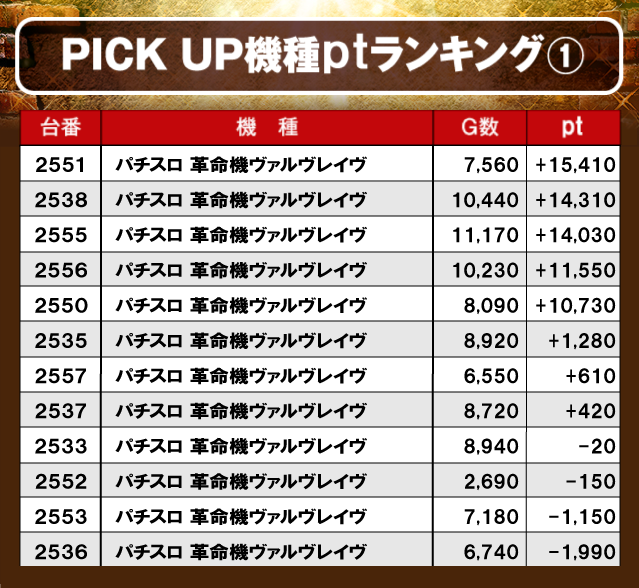 万ptOVERを5台輩出した『パチスロ 革命機ヴァルヴレイヴ』。回転数を見てもじっくりと遊戯された形跡が確認でき、結果にしっかりと反映されていた!