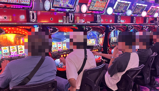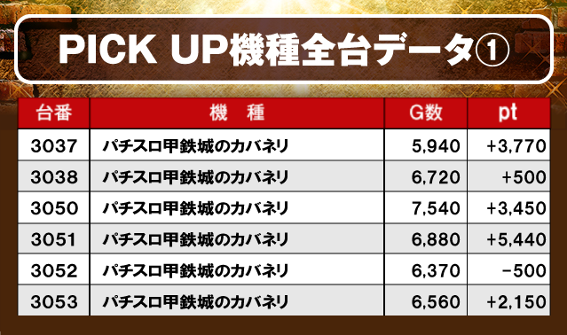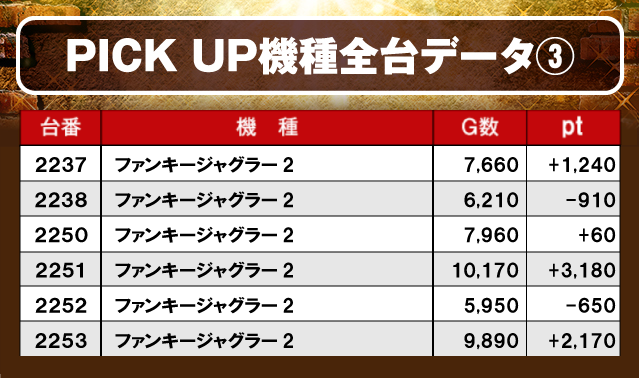 今回、全台で盛り上がりを見せたのが『パチスロ甲鉄城のカバネリ』『ネオアイムジャグラーEX』『ファンキージャグラー2』の3機種だ! 『パチスロ甲鉄城のカバネリ』では6台中4台が4桁プラスのptを達成し、熱気が漂っていた。一方、『ファンキージャグラー2』は万回転を記録している台もあり、周囲の期待が高まる中、ファンたちの笑顔が絶えなかった。どの機種も熱い展開を見せ、可能性を秘めたエリアとなっていたのは間違いないだろう!