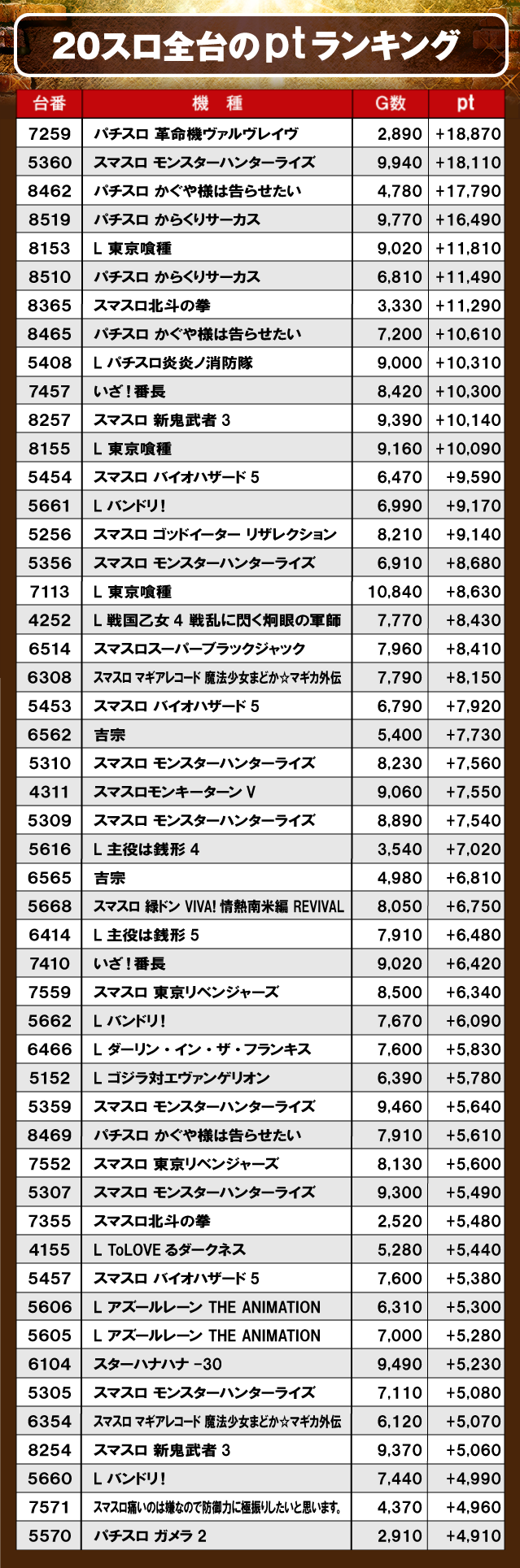 機種単位で大きな盛り上がりを披露した『スマスロ モンスターハンターライズ』。なかでも頭ひとつ飛び抜けた結果だった5360番台が+18,110ptと驚異的な数字を打ち立て、強烈な存在感を放った。さらに、設置台数の半数以上がプラスpt終了という素晴らしい結果を残しており、ファンたちはその熱気に圧倒されたことだろう!