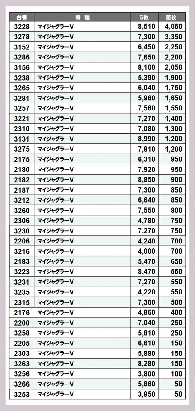 ※差枚数順に掲載しています