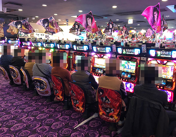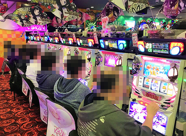 開店直後のパチスロでは、「SLOT魔法少女まどか☆マギカ」や「バジリスク~甲賀忍法帖~絆」など、多数の機種が満席。