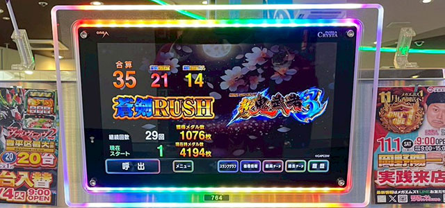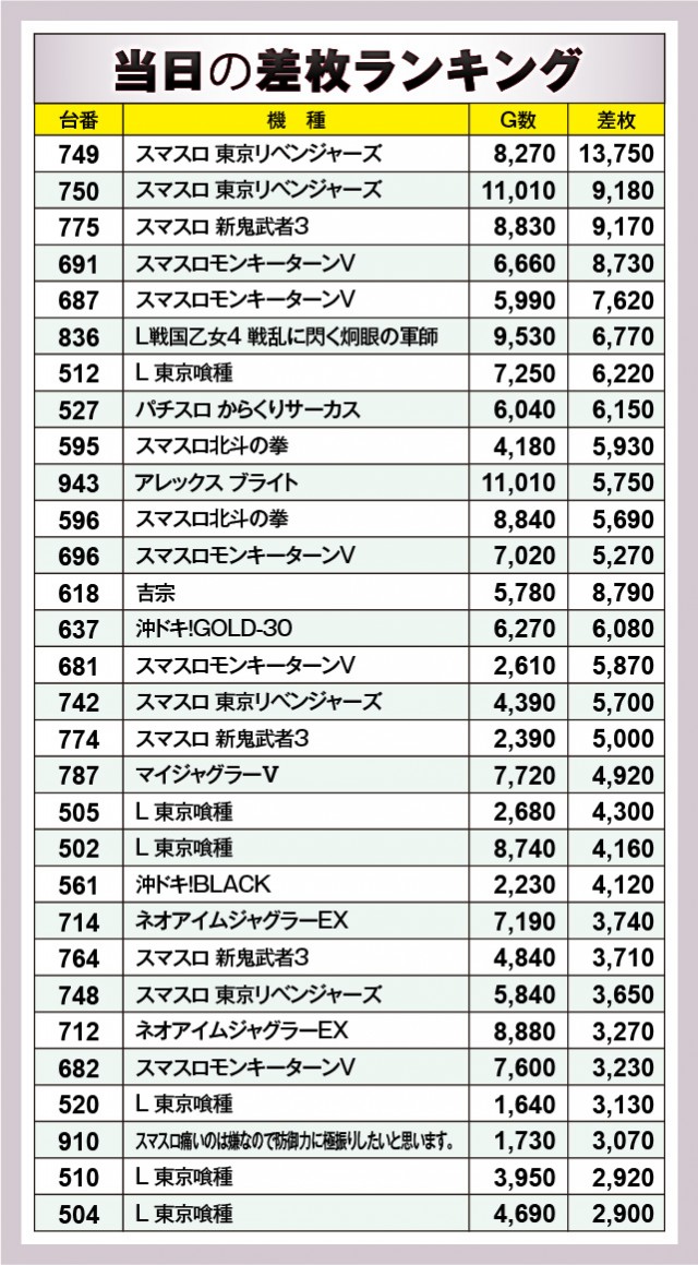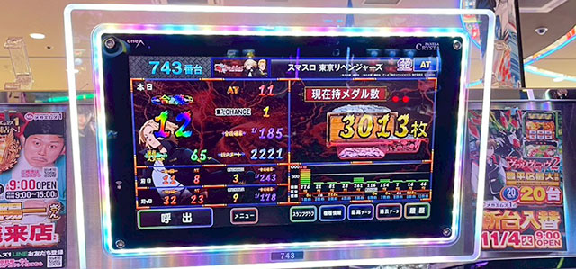 『スマスロ 東京リベンジャーズ』にて13,750枚&9,180枚という凄まじい熱気が放たれ、店内の盛り上がりを大きくリード。他にも『スマスロ 新鬼武者3』『スマスロモンキーターンV』などが気を吐いており、人気機種たちが盛り上がりの中心にいたのは確かだ。また回転数に着目すると、万回転OVERを達成する台も見られる。ファンが好感触を掴んでいたのは明らかで、有意義な時間を過ごしていたことだろう。