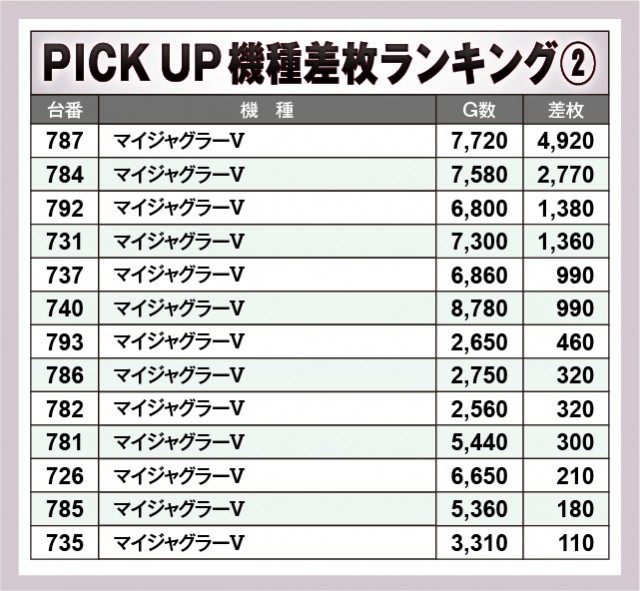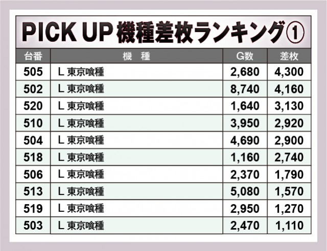 『L 東京喰種』『スマスロ 新鬼武者3』からは大きな熱気が放たれ、遊技していたファンを魅了していた機種と言える。終日を通して打ち込まれた形跡も確認でき、明らかな手応えを感じていたのは間違いない。また『マイジャグラーⅤ』も安定したパフォーマンスを披露しており、回転数と差枚数が比例する展開が顕著だ。その中で4,920枚と大きな熱量が見られ、遊技していたファンも口角を緩めていたに違いない。