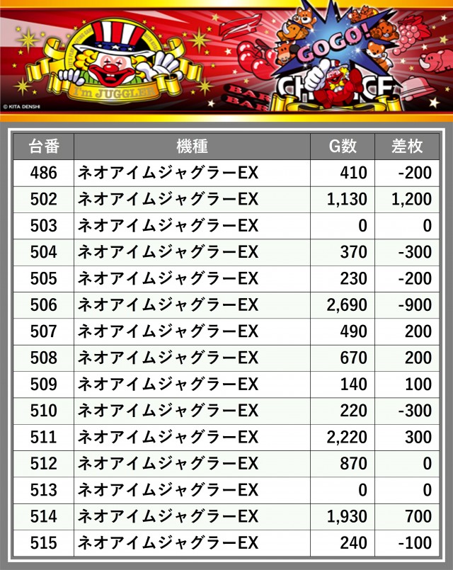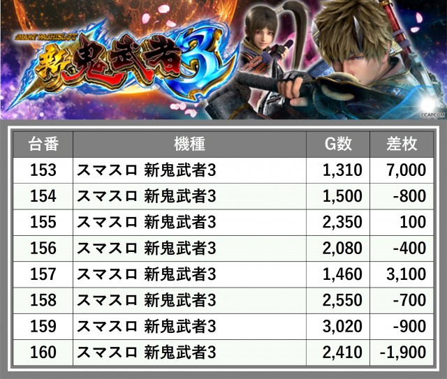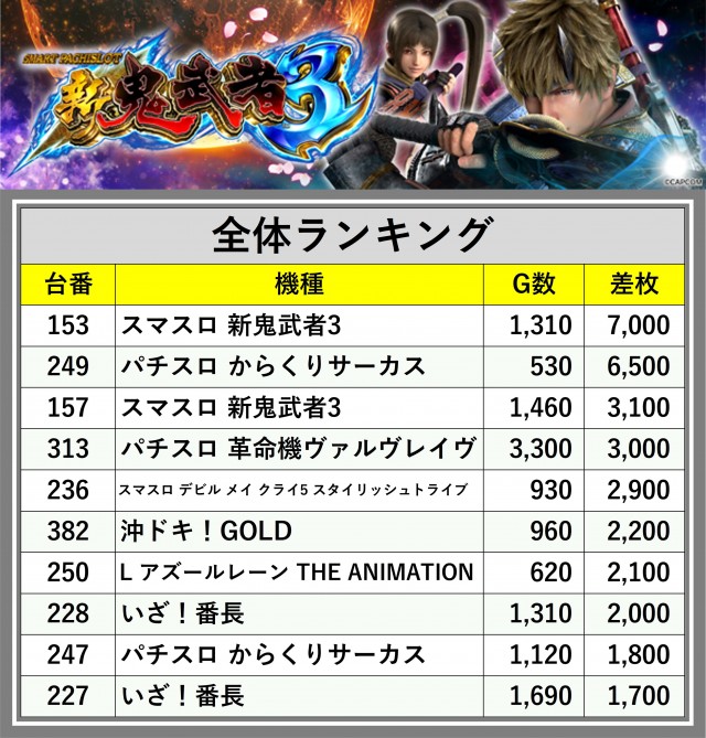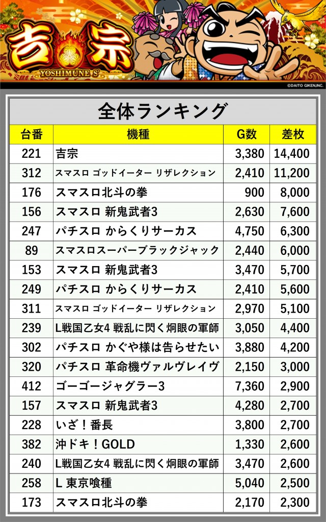 厳選された取材対象機種をはじめ、その他スロット全体から好記録が飛び出した!プレイヤーが楽しんだ1日を下記データにて振り返ってみて欲しい。