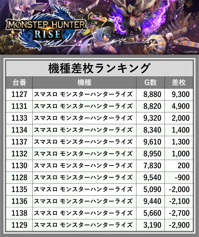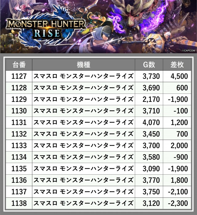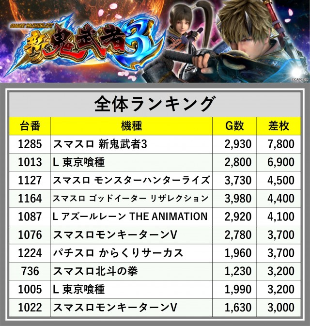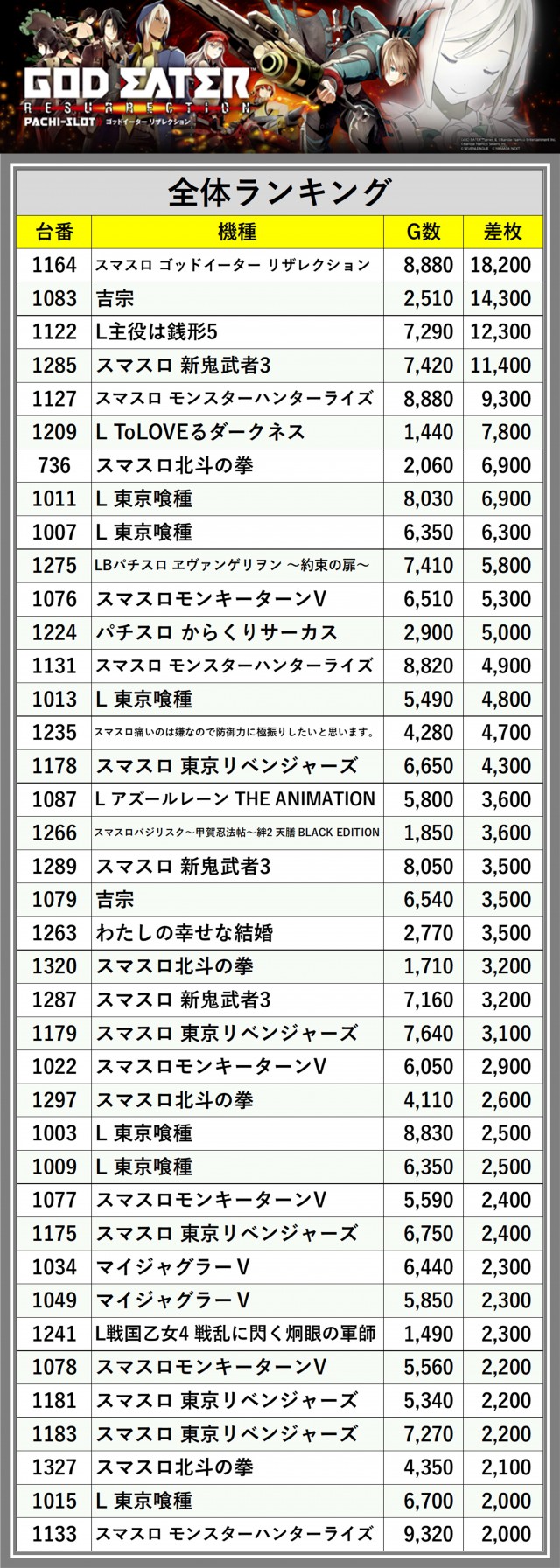 厳選された取材対象機種をはじめ、その他スロット全体から好記録が飛び出した!プレイヤーが楽しんだ1日を下記データにて振り返ってみて欲しい。