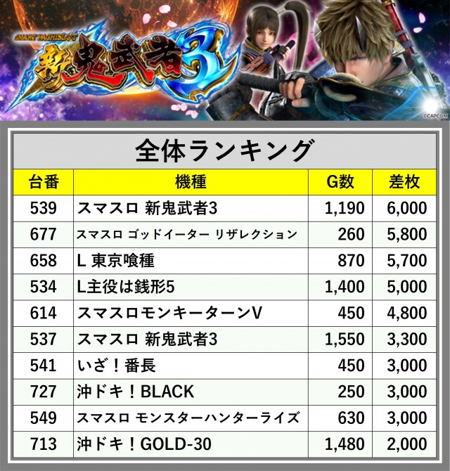 厳選された取材対象機種をはじめ、その他スロット全体から好記録が飛び出した!プレイヤーが楽しんだ1日を下記データにて振り返ってみて欲しい。