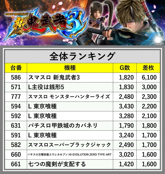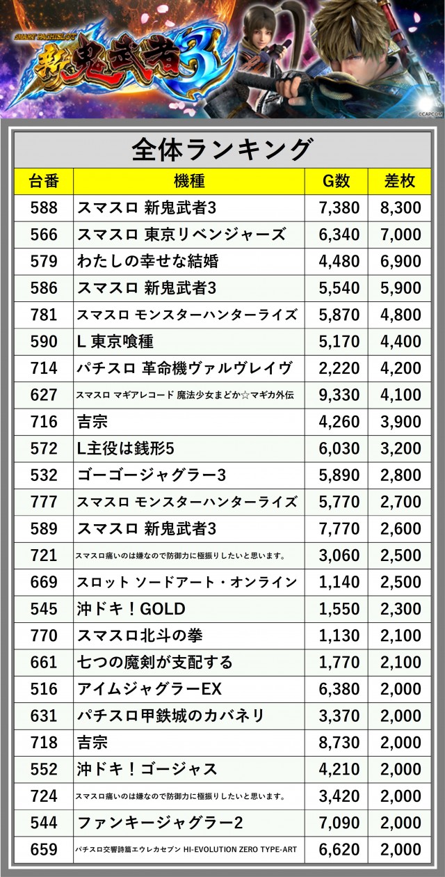 厳選された取材対象機種をはじめ、その他スロット全体から好記録が飛び出した!プレイヤーが楽しんだ1日を下記データにて振り返ってみて欲しい。