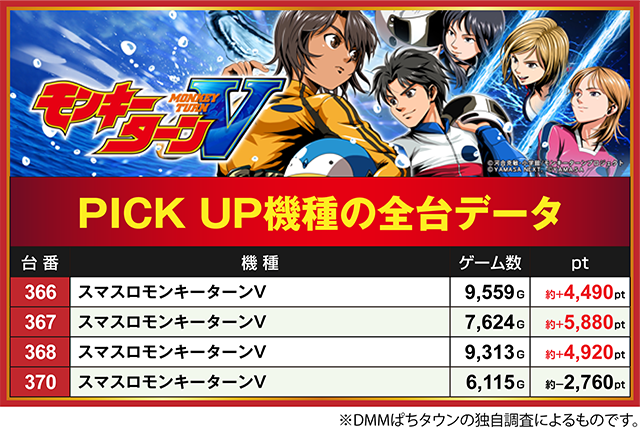 「スマスロモンキーターンV」では、3台が約+4,400pt以上となり、367番台が約+5,800ptオーバー。