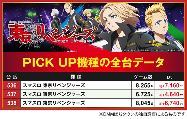 「スマスロ 東京リベンジャーズ」は設置されている3台のすべてが約+4,600ptを上回り、約+7,100ptを超えた台もあった。