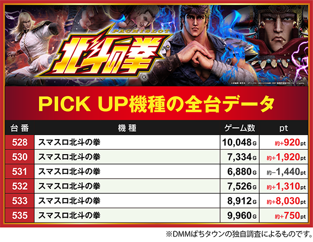 6台中5台がプラスとなった「スマスロ北斗の拳」は、533番台が約+8,030pt。