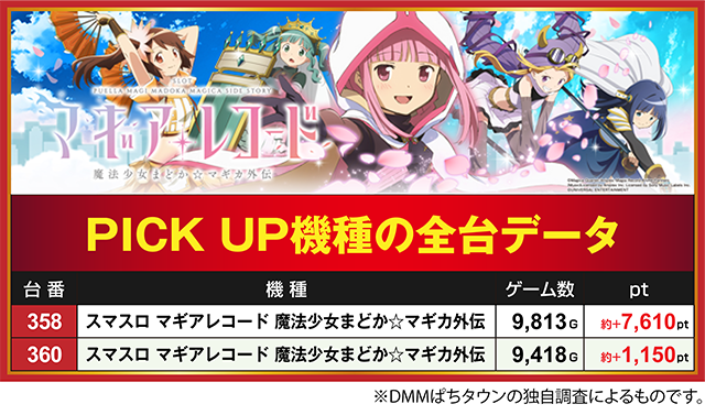 全台が約+1,100ptを超えた「スマスロ マギアレコード 魔法少女まどか☆マギカ外伝」でも、約+7,600pt以上となった台を確認した。