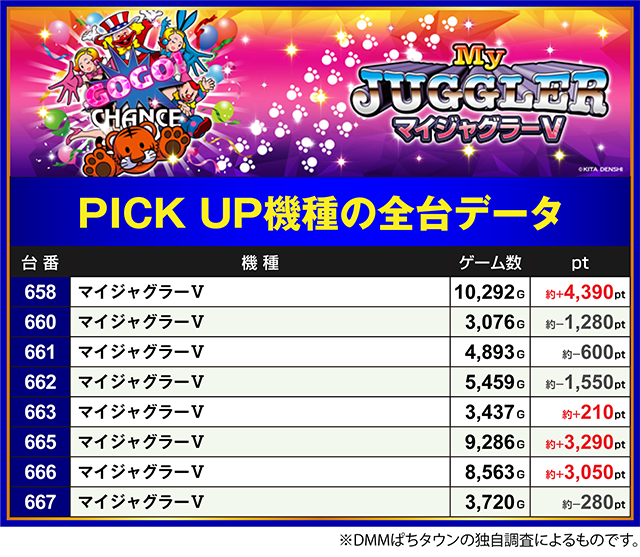 12日(日曜日)の「マイジャグラーⅤ」は、658番台が約+4,390pt。