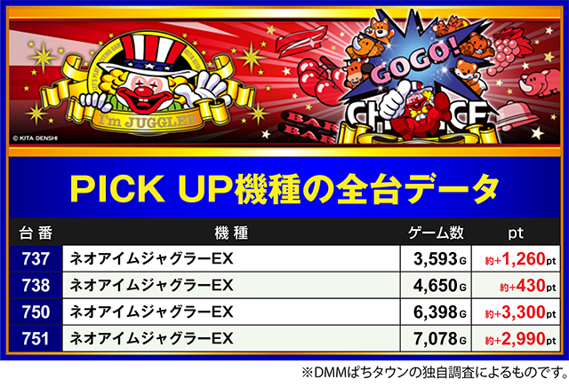 「ネオアイムジャグラーEX」は設置されている4台のすべてがプラス。