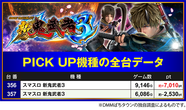 最新機種では、「スマスロ 新鬼武者3」の356番台が約+7,010ptを記録した。