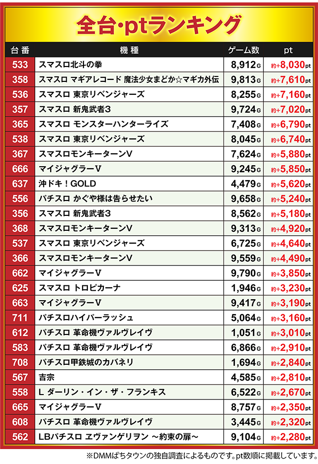 ほかにも、「スマスロ モンスターハンターライズ」の365番台や「スマスロ北斗の拳」の533番台などが約+6,100ptを超えた。
